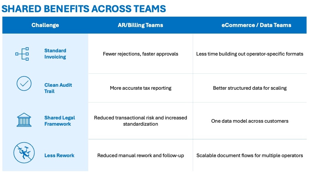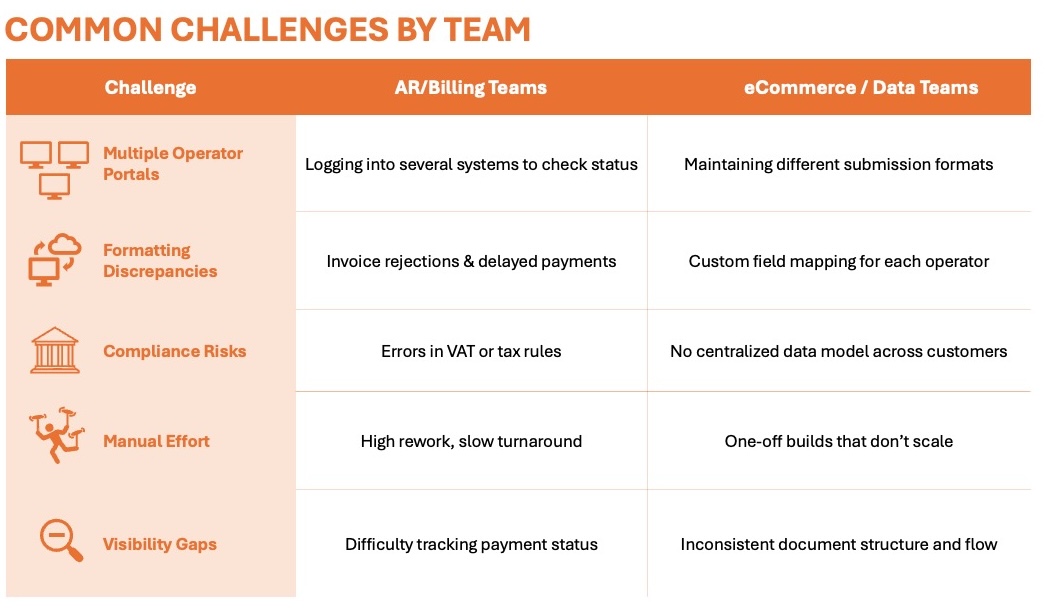 Without a consistent framework, every new operator brings a new invoicing format, new validation rules, and more chances for mismatches. AR teams chase approvals and payment updates, while eCommerce teams scramble to adapt file structures and document flows.